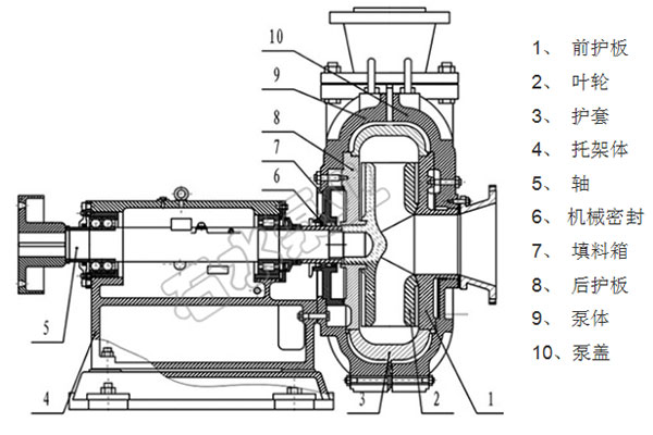 軸封裝置對泵體和泵軸之間起密封作用??煞乐箍諝馇秩氡脙?nèi)和大量水從泵內(nèi)滲漏出來。離心渣漿泵的密封形式我廠通常采用的是副葉輪加填料密封,副葉輪加填料密封是流體動(dòng)力密封,靠副葉輪產(chǎn)生的壓頭抵抗葉輪出口液體的外漏,同時(shí)利用葉輪蓋板設(shè)背葉片加水封環(huán)和填料來防止空氣進(jìn)入,又用背葉片和水封環(huán)降低填料處的壓力,有防止雜質(zhì)進(jìn)入密封的作用。